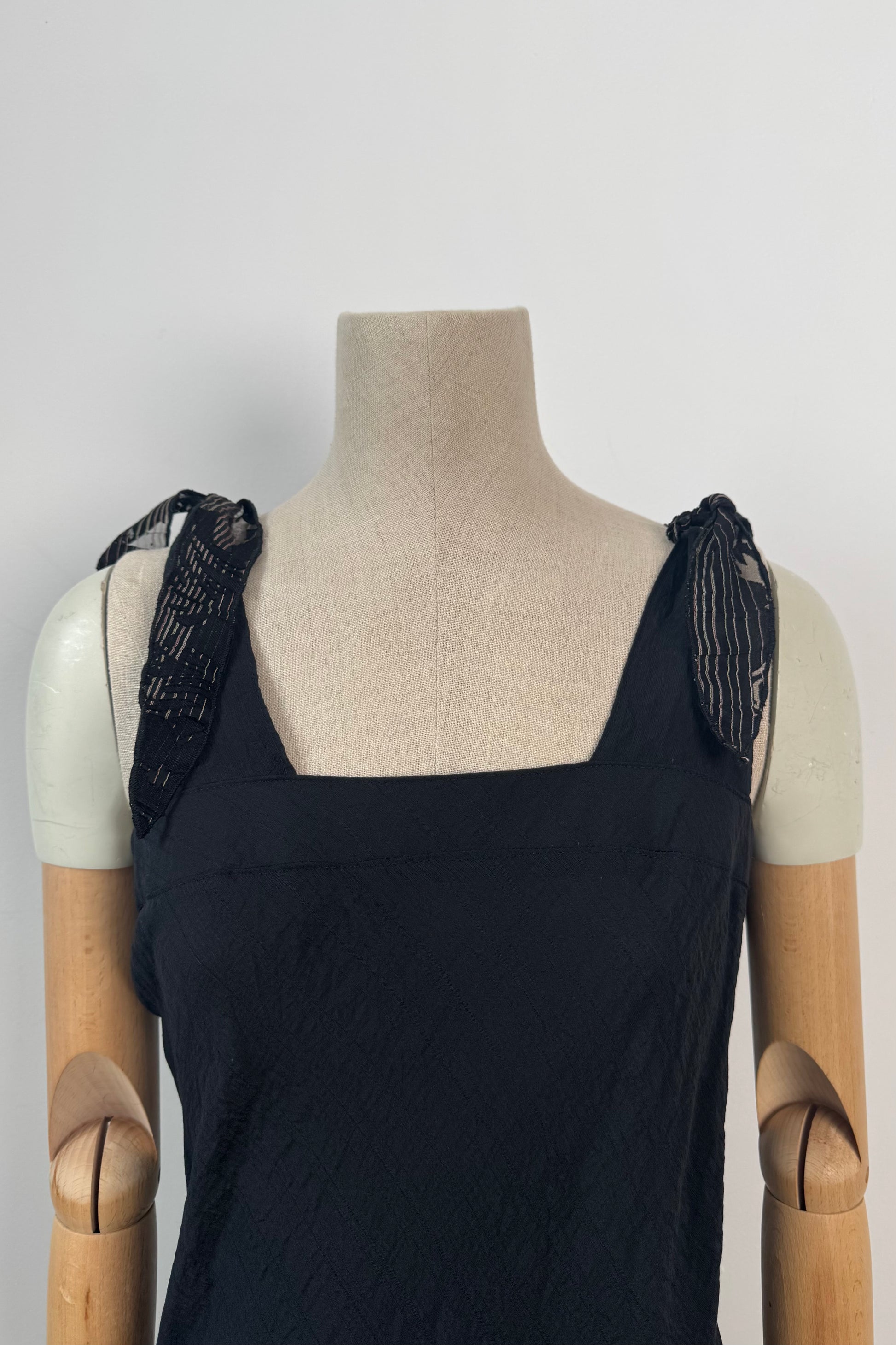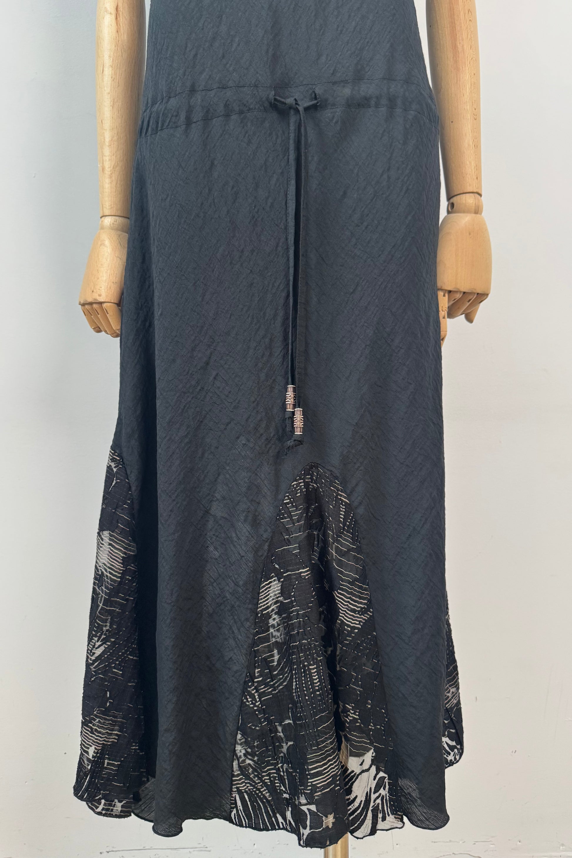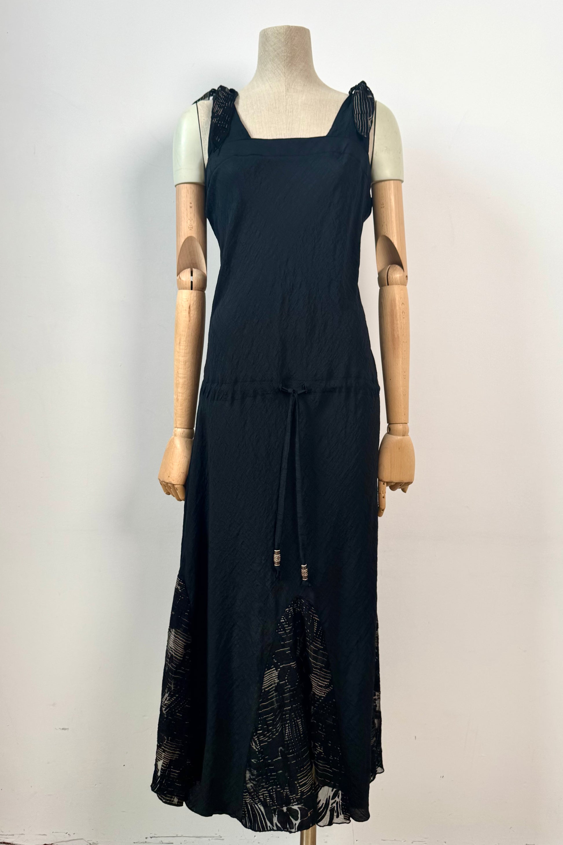 A romantic Italian-made dress. Features a lace panel with tie lace shoulders and drawstring detail at the hip. A dress that blends classic femininity with modern ease. Made from soft polyester-viscose, has a flowing silhouette that flatters the body while maintaining structure. The design fits closer at the bust and widens beautifully at the hips perfect for elegant evenings or layered with a jumper for daytime wear.
