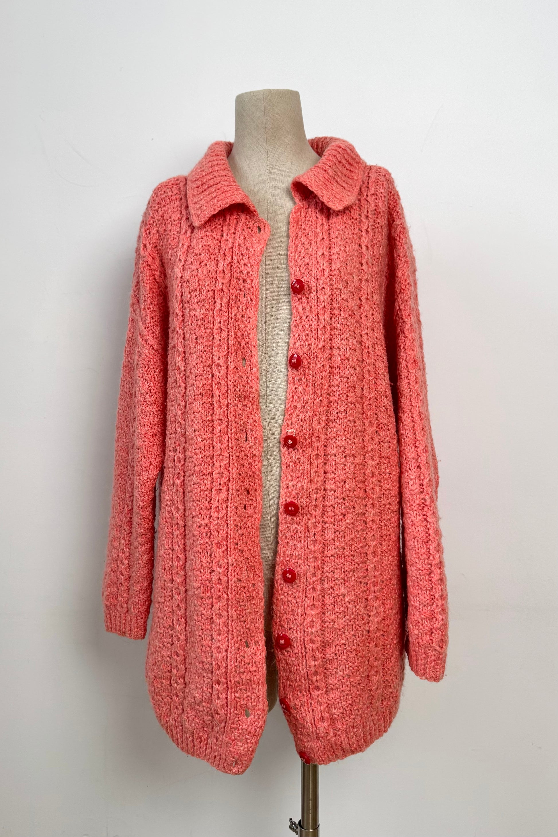 A soft wool-acrylic blend cardigan in a warm coral hue. Designed with slouchy sleeves and a relaxed silhouette that drapes beautifully, perfect for layering over dresses or denim for an effortless vintage charm or for home.
