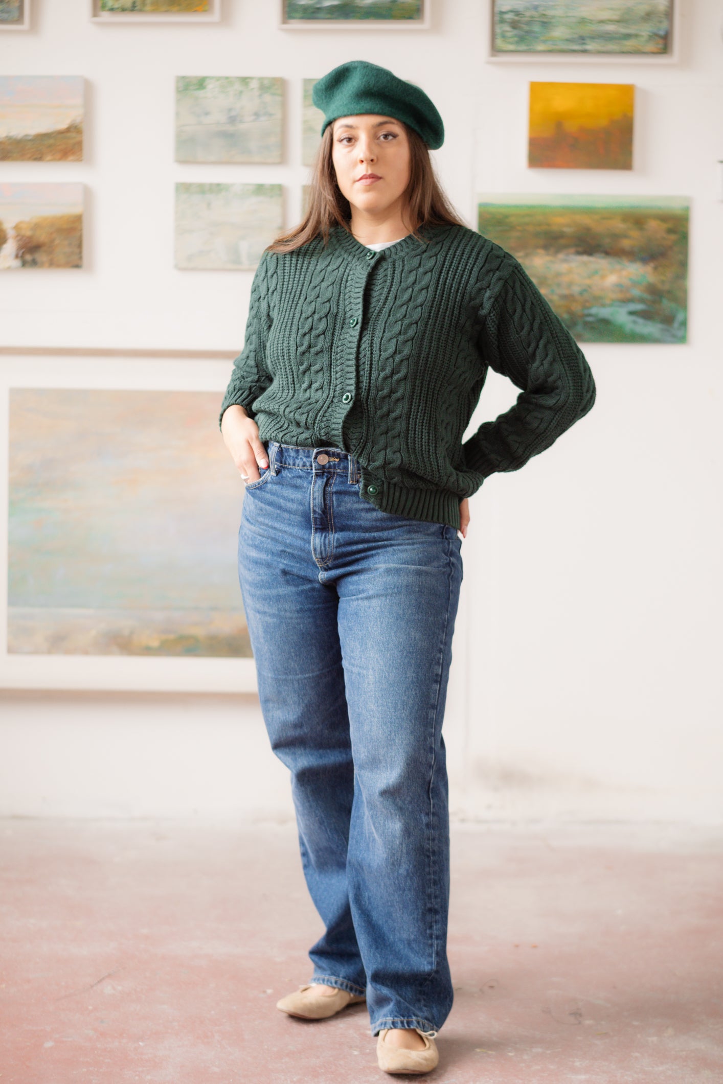 A stylish dark emerald green cardigan featuring a rounded collar and cable knit detailing. Crafted for both warmth and elegance, this piece adds texture and sophistication to any outfit!