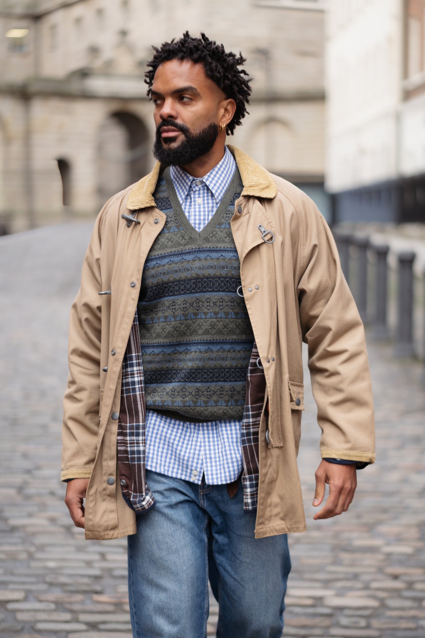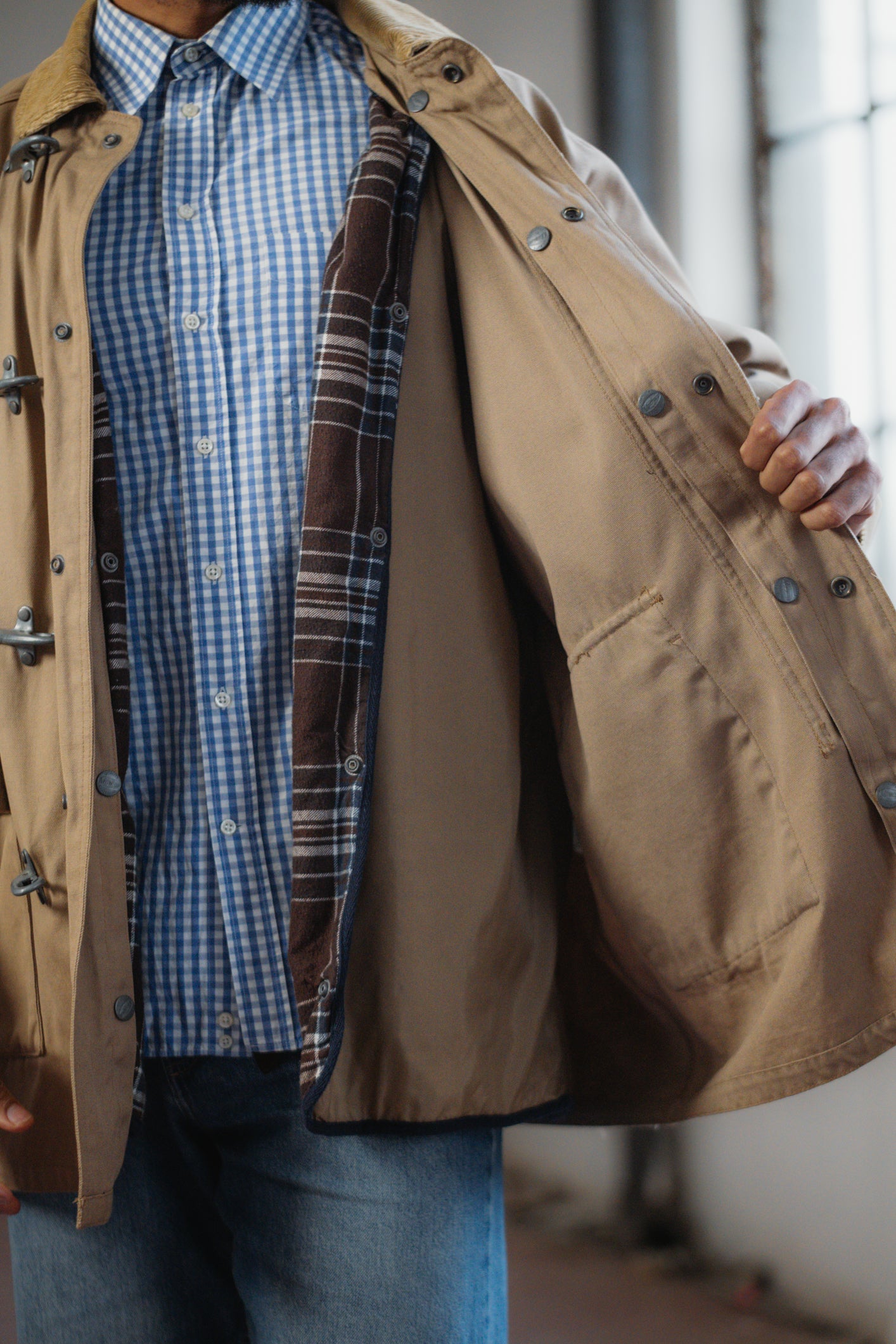 Incredible fireman-style jacket with metal clasp fastenings, a contrasting corduroy collar, and corduroy trim on the cuffs. A bold yet timeless outerwear piece with strong vintage character.