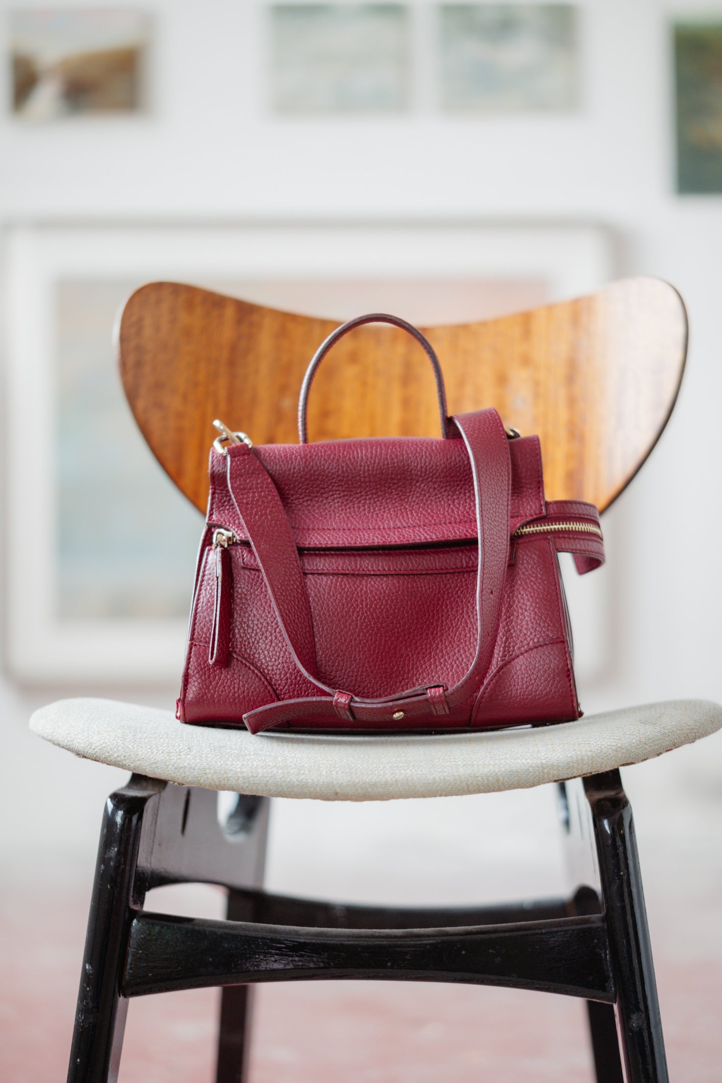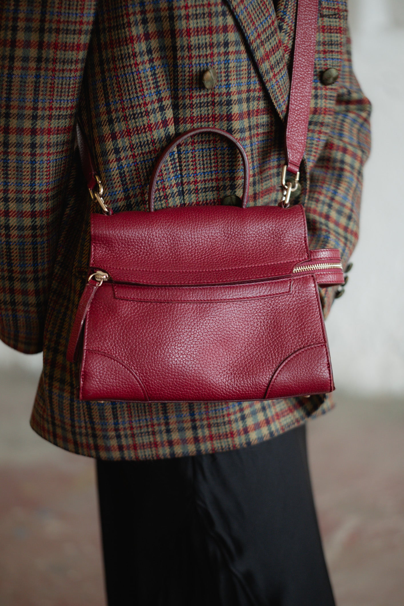 Details: Gold clasps, zip detail, burgundy interior lining, embossed brand label, crossbody strap detachable