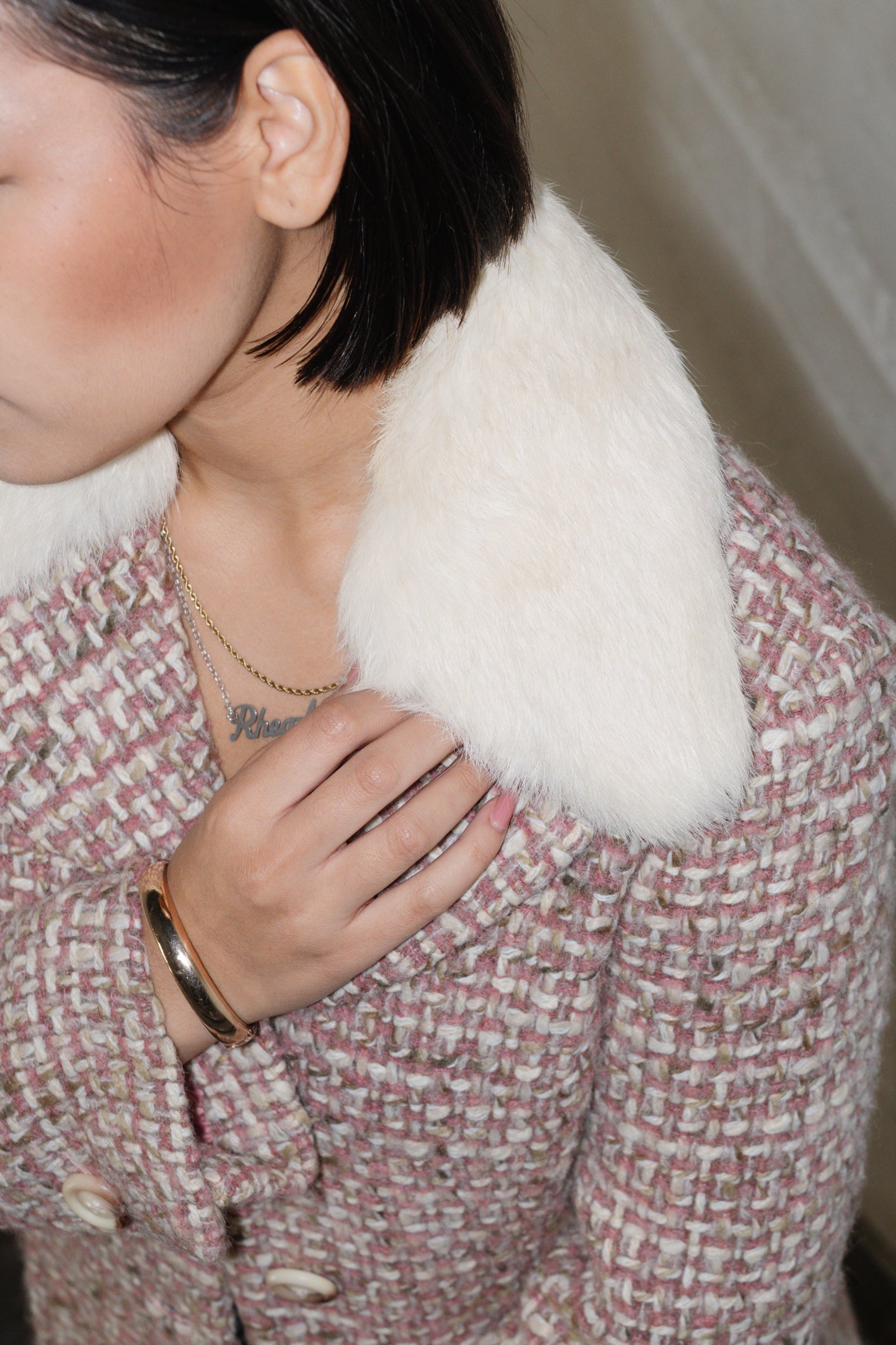 A chic vintage Max & Co woven coat in light nude pink, accented with hints of cream, pink, and subtle green. Featuring a removable rabbit fur collar, this 100% virgin wool coat exudes timeless Italian craftsmanship.