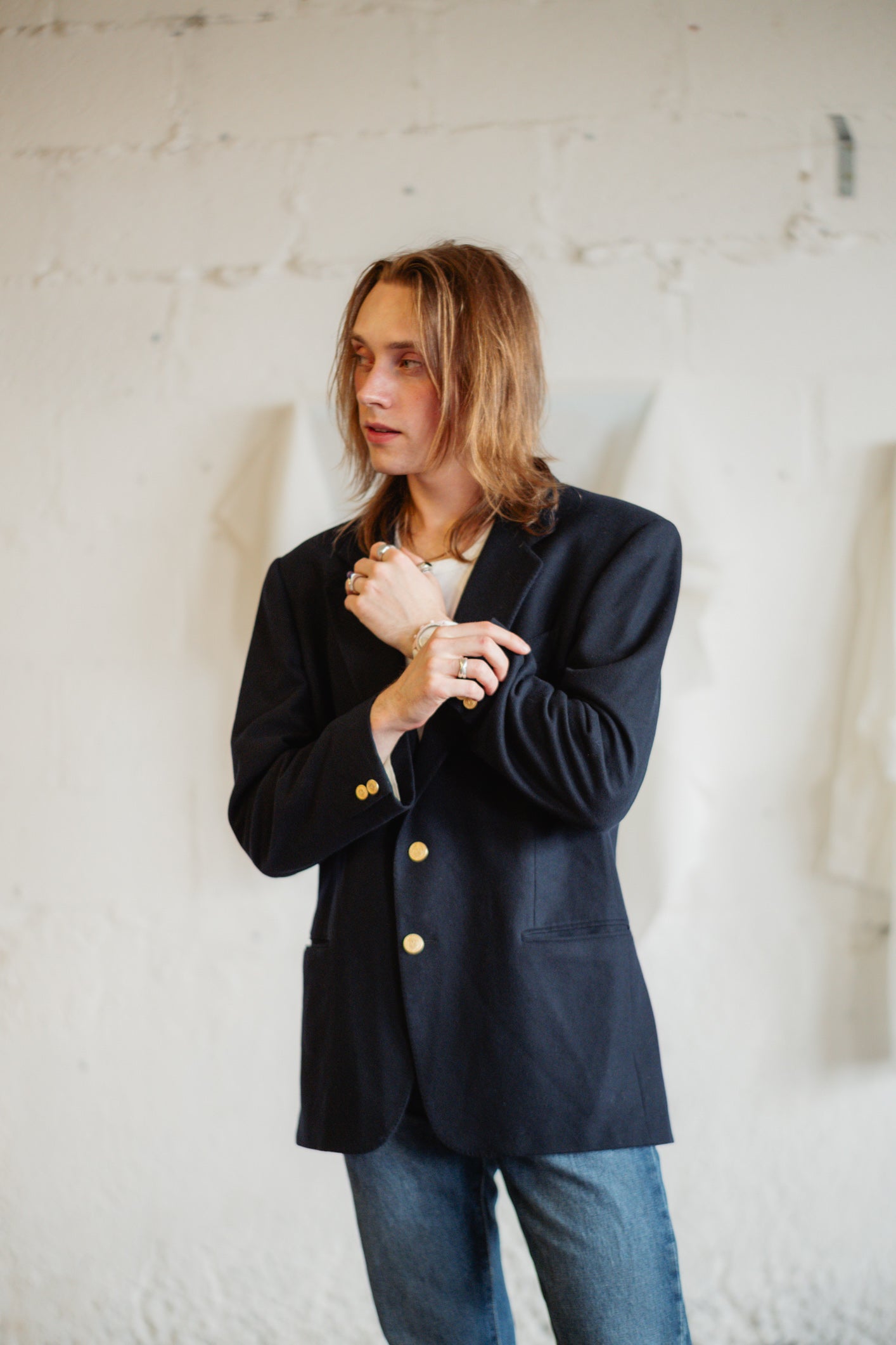 Category / SEO Tags: Valentino Uomo, Vintage Blazer, Men’s Navy Wool Blazer, Italian Designer Menswear, Gold Button Blazer, Tailored Jacket- Gold Buttons, Italian Designer, L or XL