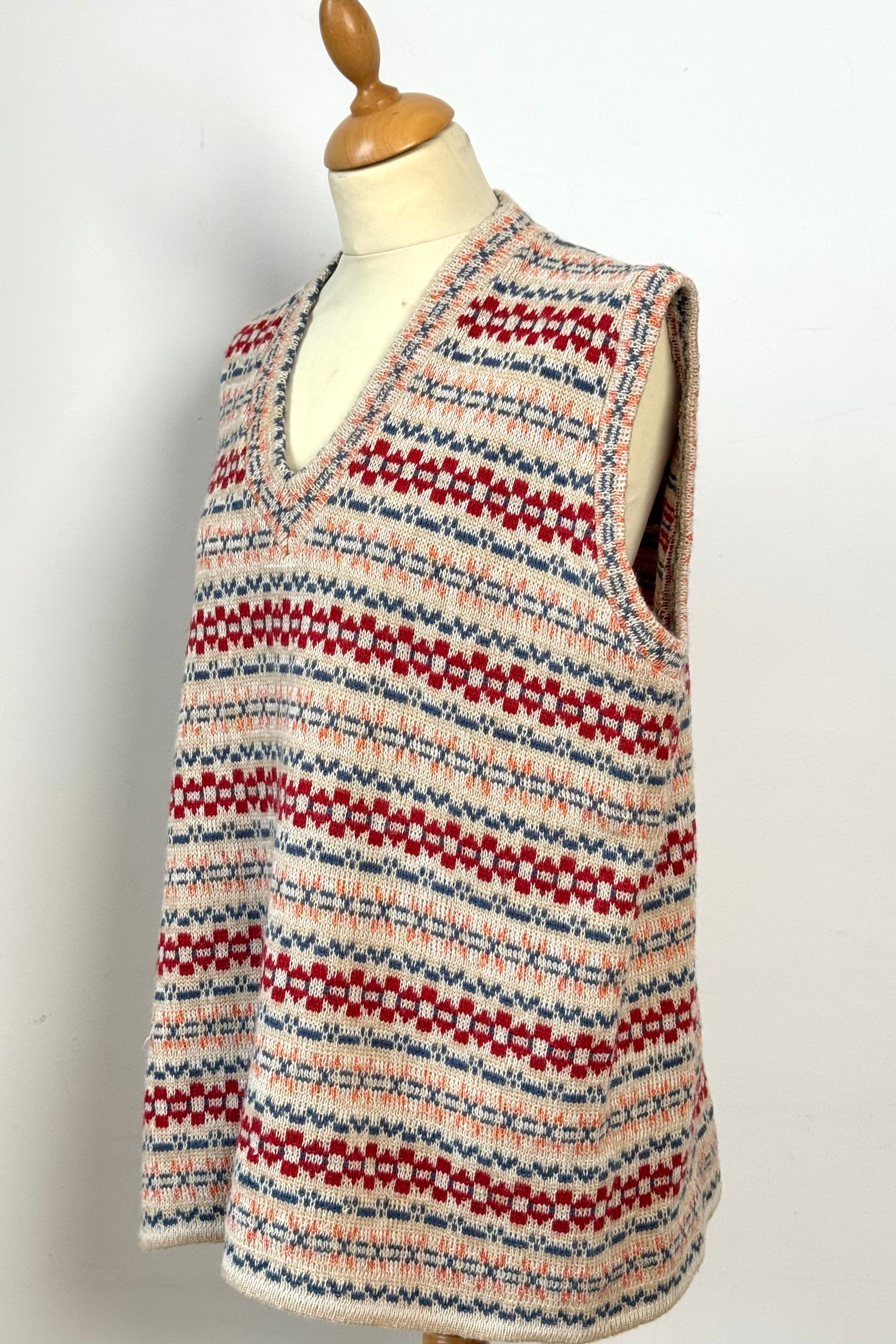 Beautiful patterned knit vest in beige with orange, red, and blue accents.