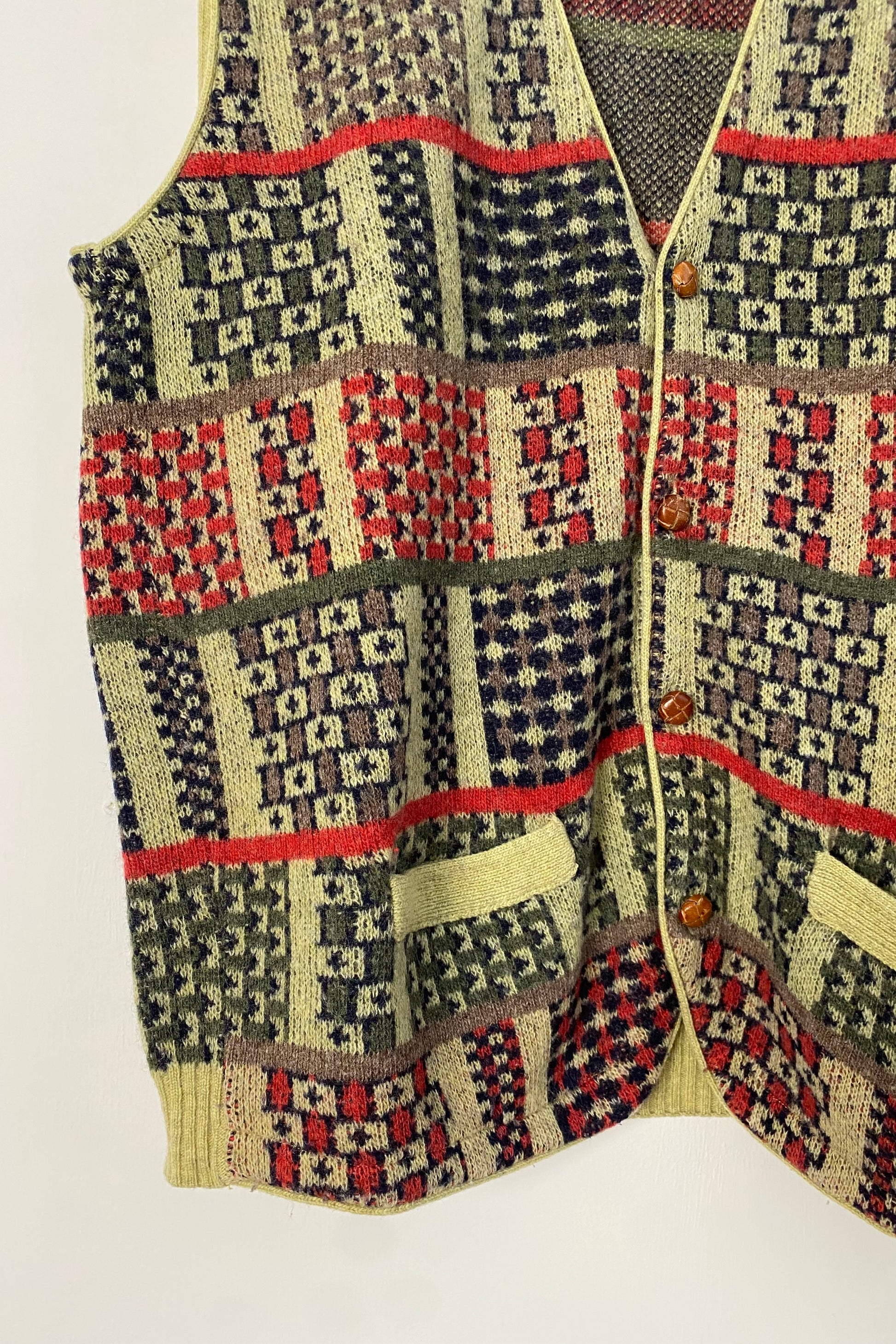 Vintage sweater vest featuring a winter pattern in matcha green and burnt orange, with wooden button detailing. A well-knit piece with a classic fitted silhouette and V-neckline.