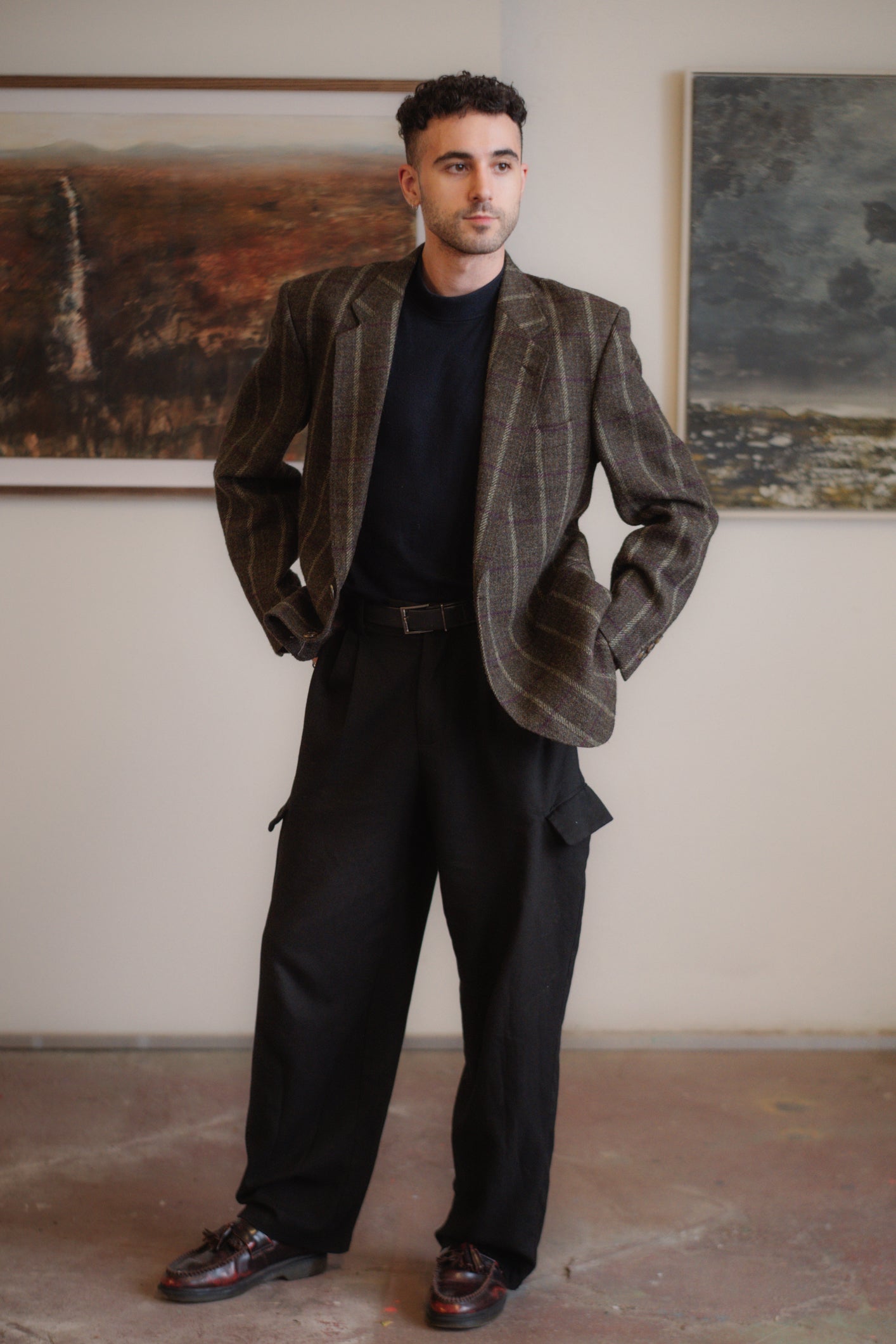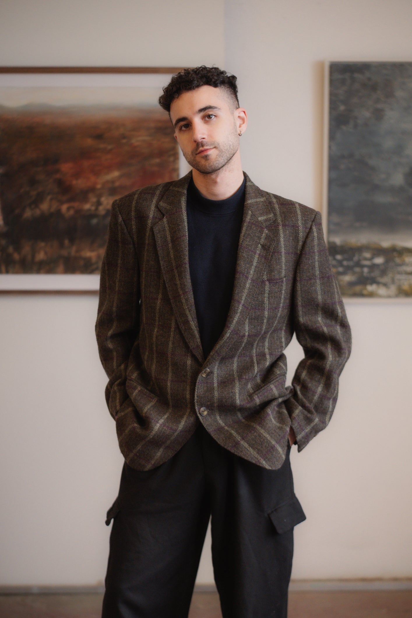 A classic tweed blazer in dark green with purple accents, made in Italy by B&sonseverytime of England. Made from pure wool, this blazer offers timeless style with front and inner pockets also.