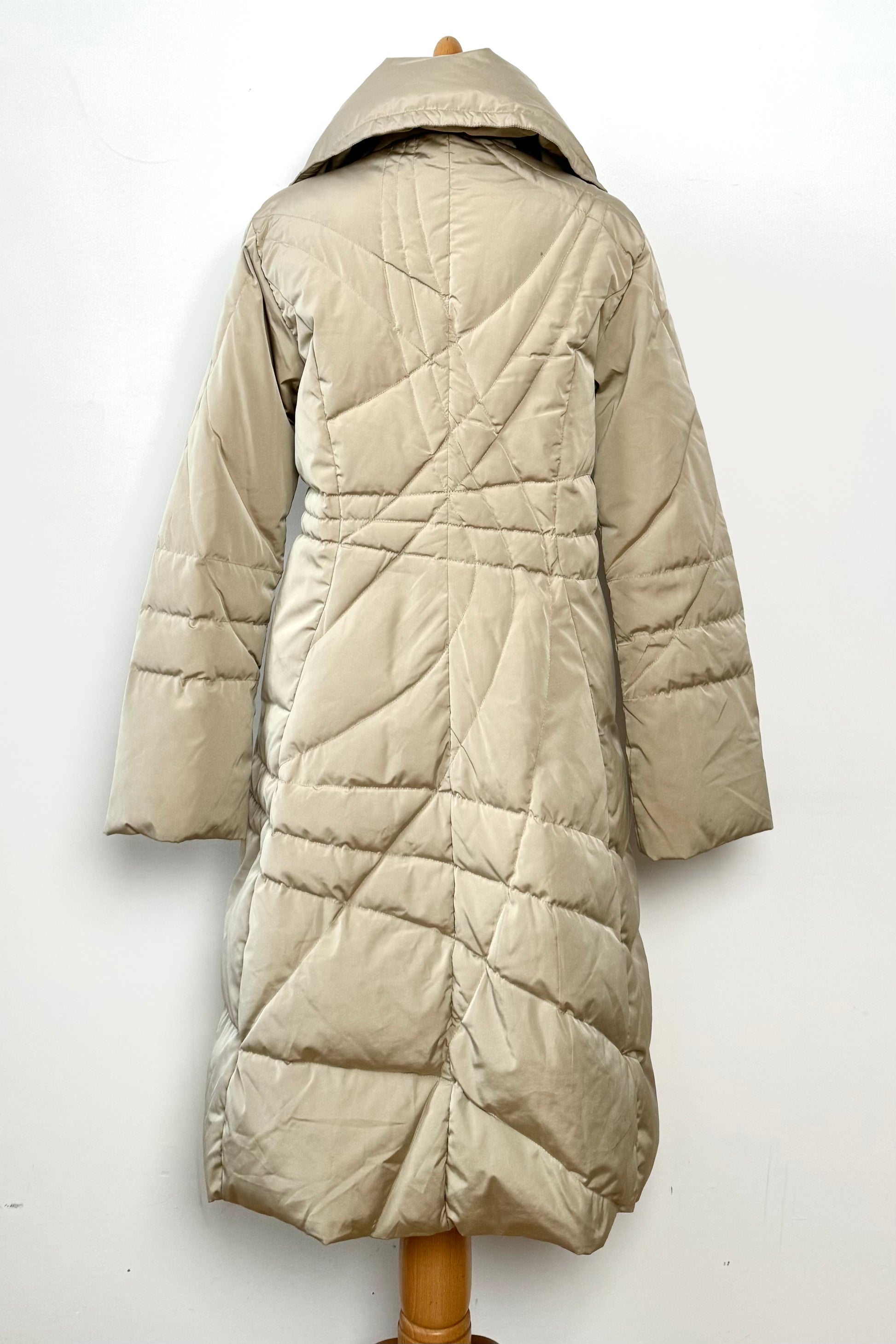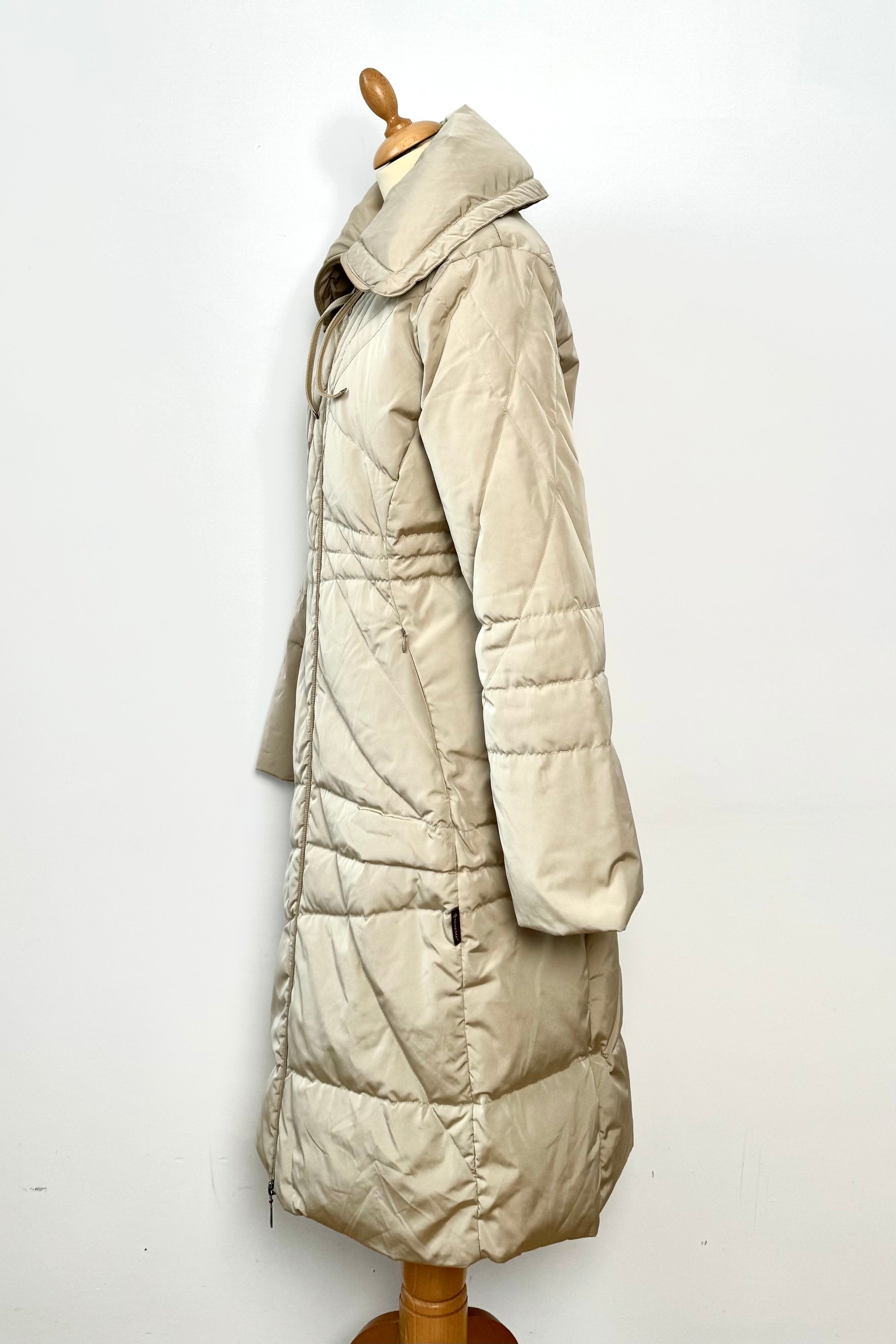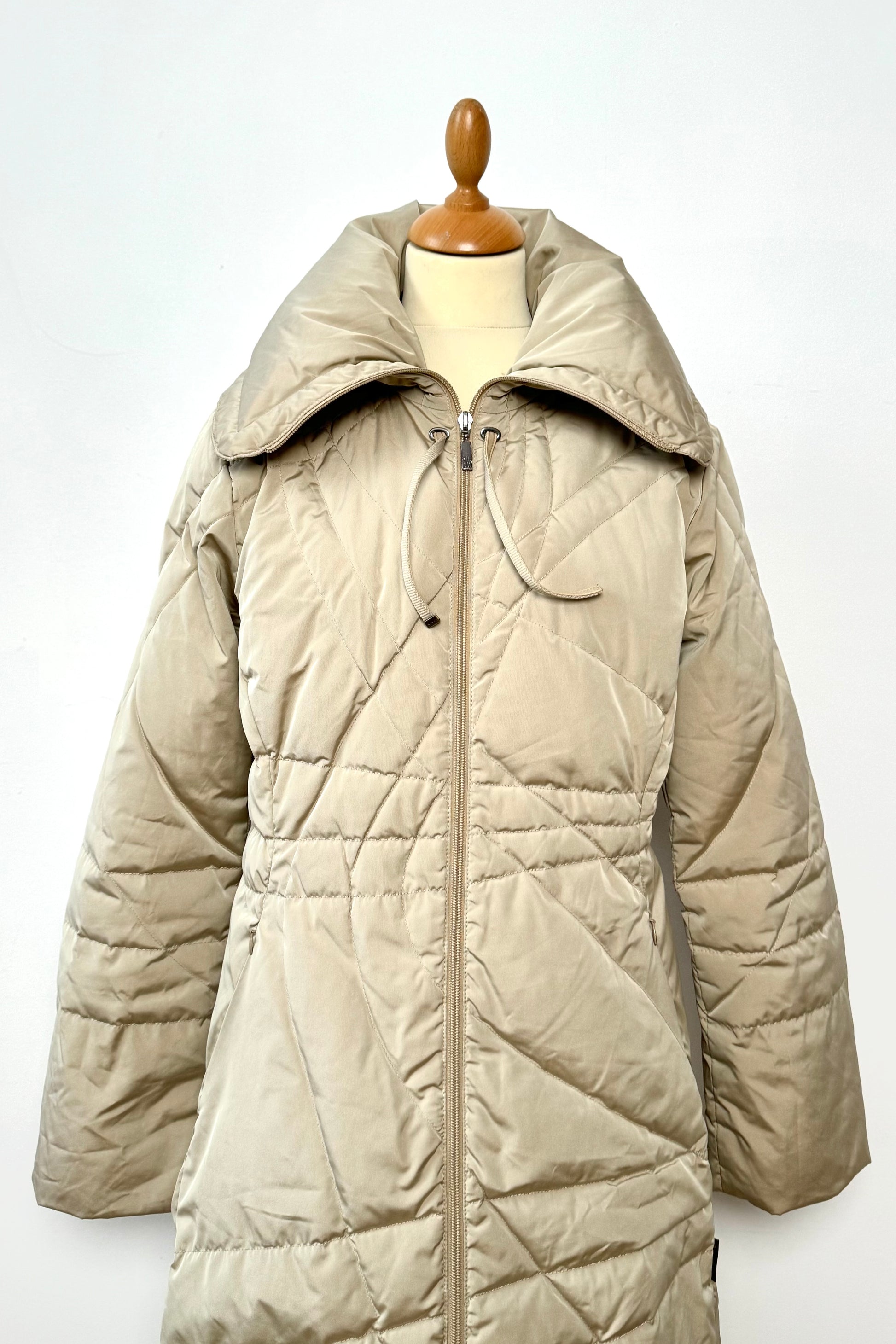 Rare vintage Moncler from 1999, crafted in luxurious goose down. Cream ivory with unique stitching and design details, including a Peter Pan collar and adjustable drawstring. An elevated, elegant take on a classic long puffer coat.